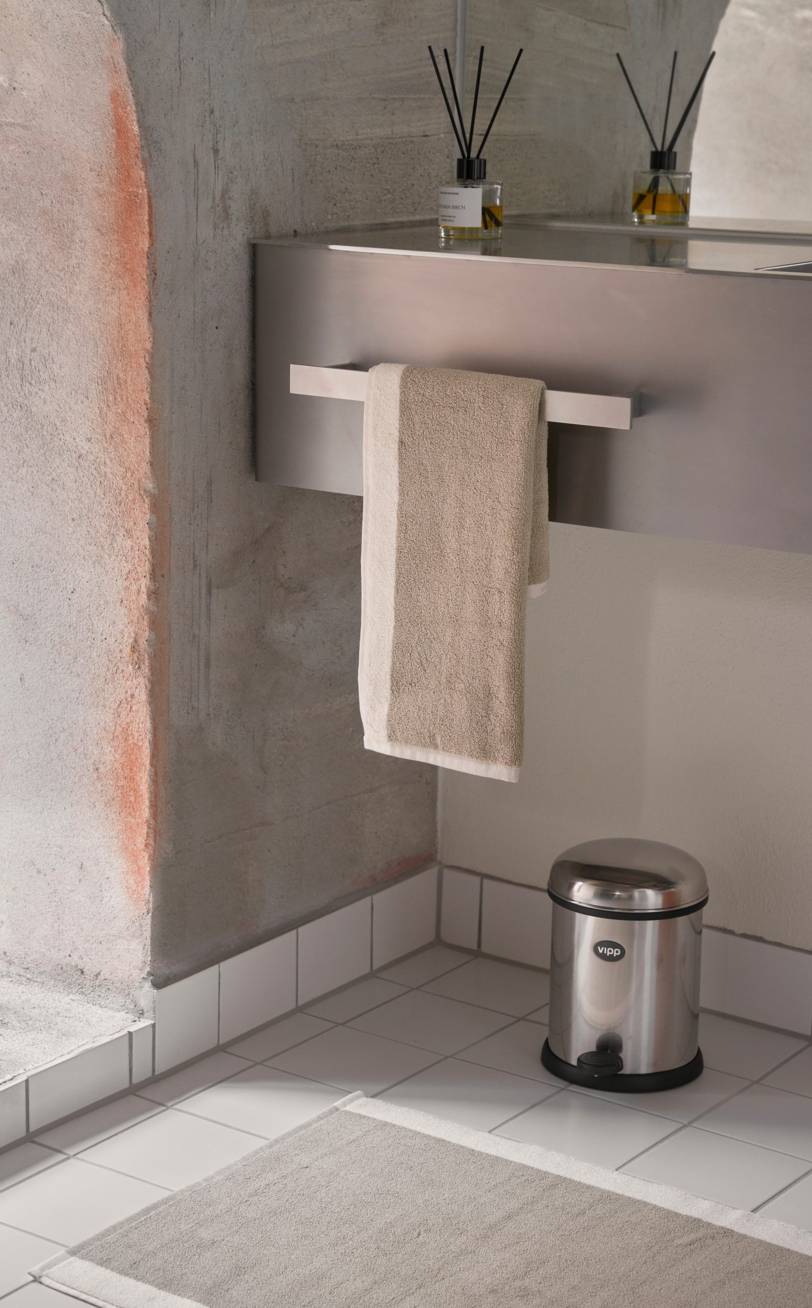 Vipp-håndklæderne er vævet i en blød bomuldsblanding, som giver høj kvalitet, god sugeevne og en behagelig følelse mod huden. De har et enkelt, ensfarvet design med en kontrastkant og er afsluttet med en praktisk strop i tekstil.