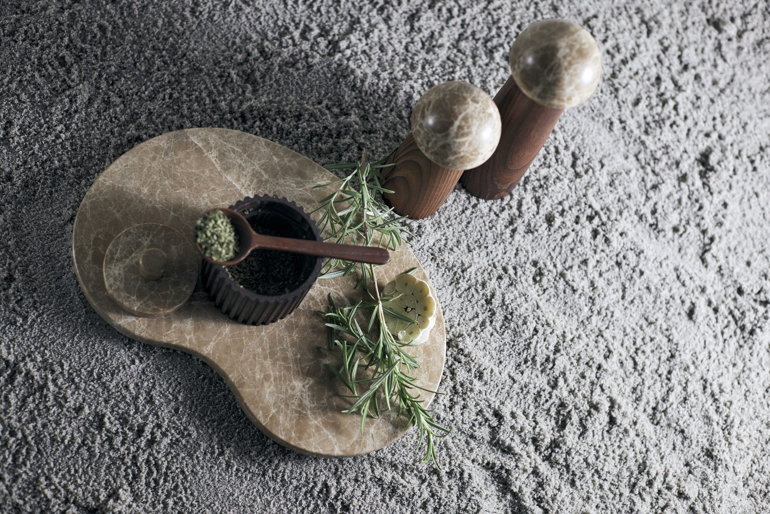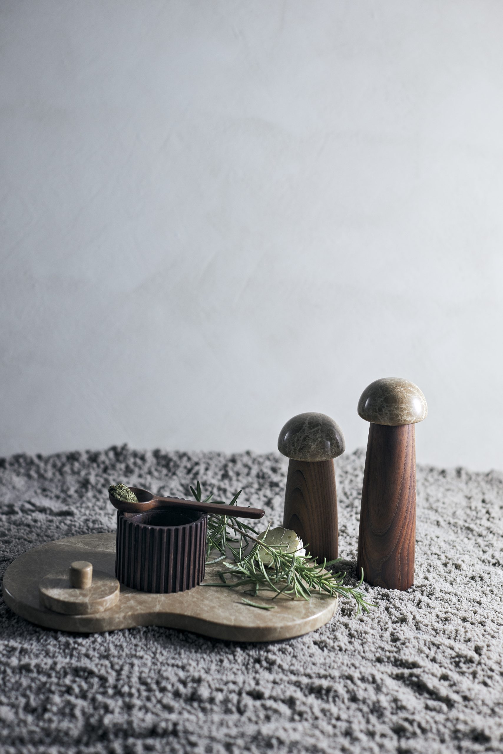 Salt- og peberkværnen i Yami serien er lavet af karboniseret asketræ og har en keramisk kværn. Dette træmateriale skaber den ikoniske mørke farve, som kendetegner Yami serien. Det lyse marmor skaber en smuk kontrast til det mørke træ, som er med til at give kant til designet. Yami salt- og pebersættet er lavet i to størrelser. Kombiner gerne den høje model med en lav, så der er mulighed for at kende forskel på salt og peber.