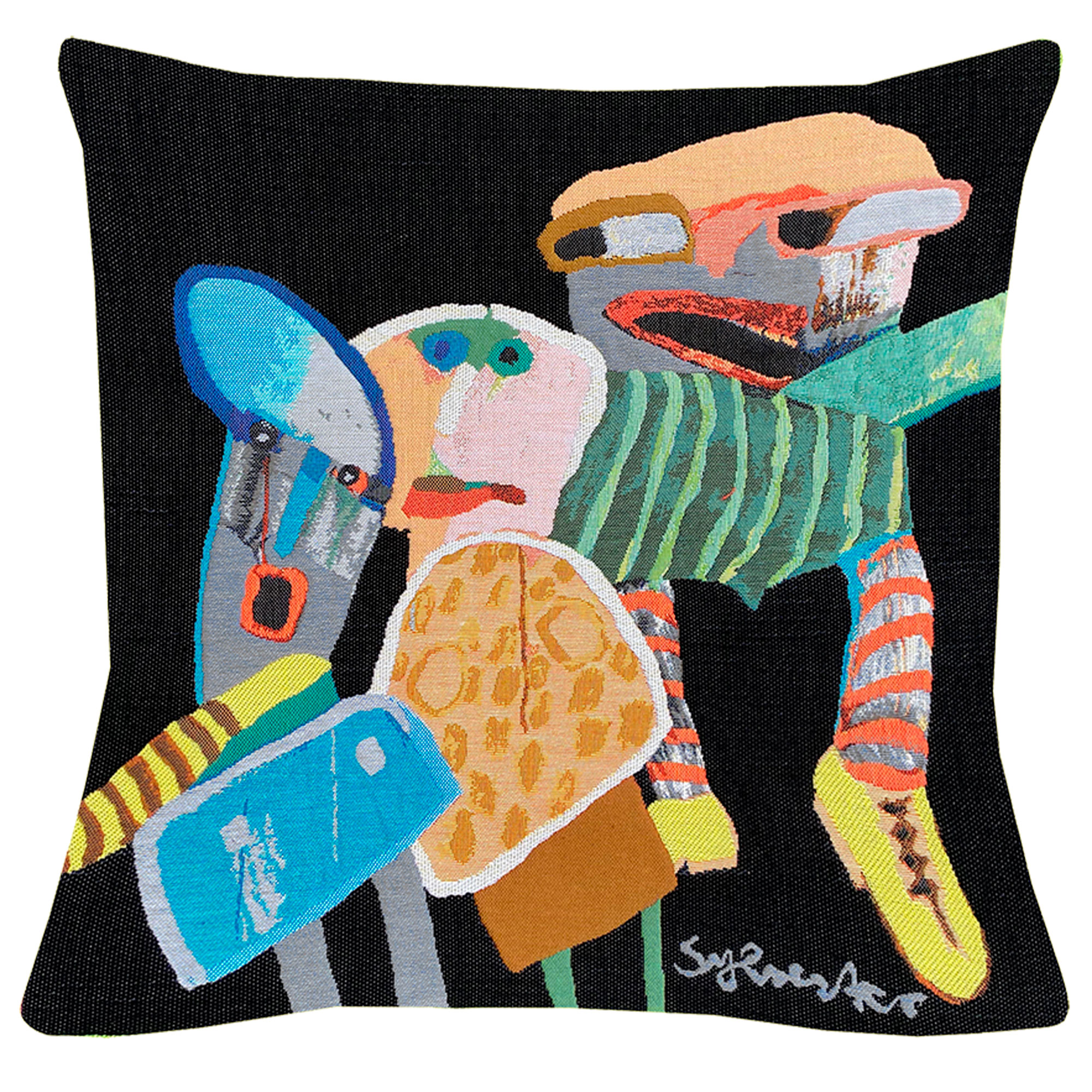 En vævet pude med kunstnerisk motiv design Leif Sylvesters med en yndlingsdel fra en af kunstværkerne. De væves af Jules Pansu i Frankrig, der har specialiseret sig i Jacquard vævning. De er blevet tildelt den prestigefyldte hædersbevisning ”Meilles Ouvrieres de France” (Frankrigs bedste håndværker) to gange.