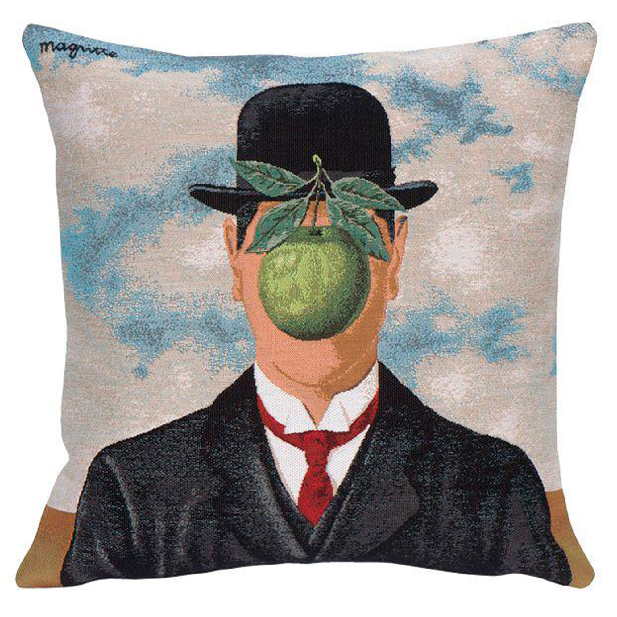La grande guerre – Magritte pude leveres med en kvalitets monteringspude produceret i Danmark. Pudebetrækket er af duntæt 100% bomuld fremstillet uden kemikalier. Fyldet er andefjer og dun. Mål: 45 x 45 cm.