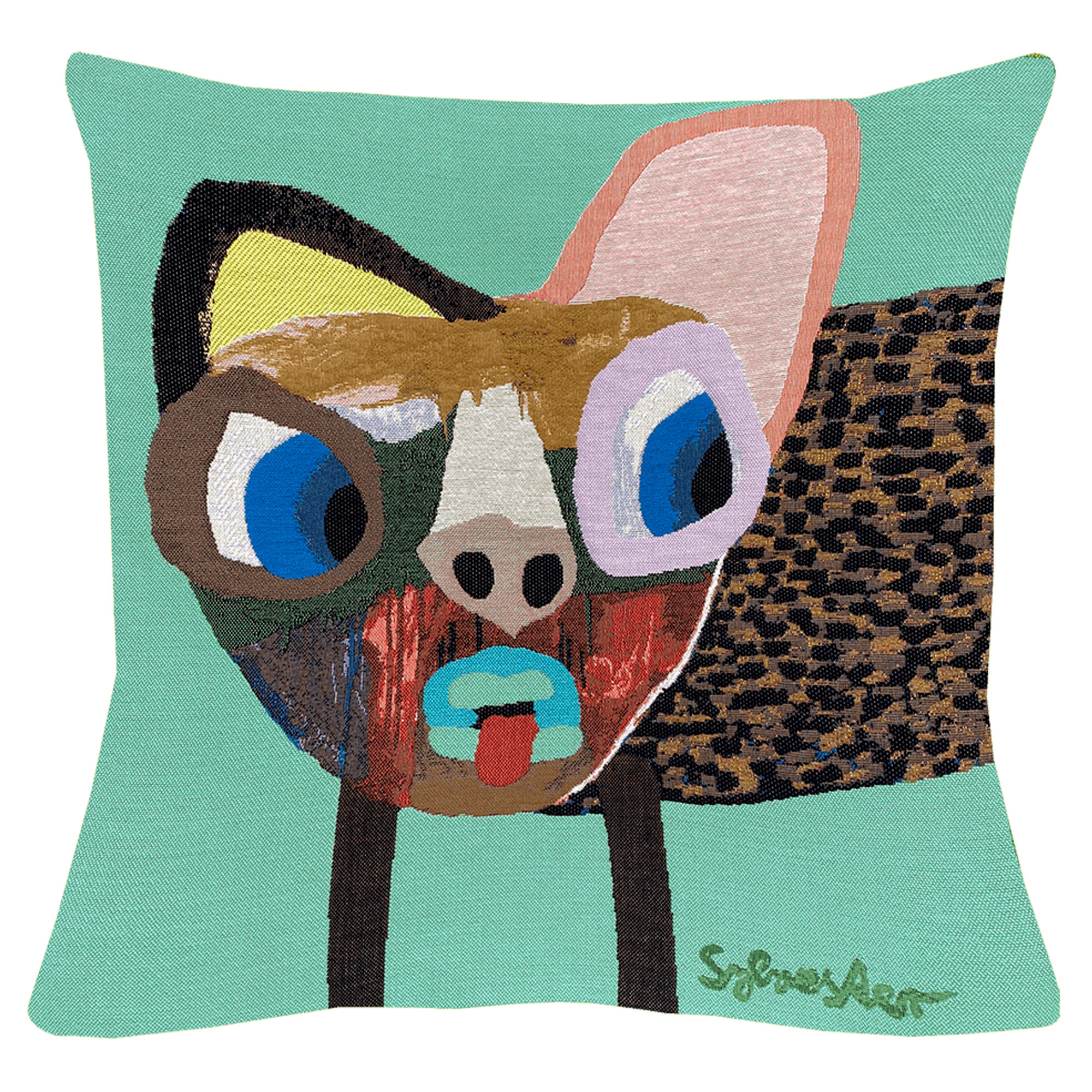 Småplettet Hund er en vævet pude med kunstnerisk motiv design Leif Sylvesters med en yndlingsdel fra en af kunstværkerne. De væves af Jules Pansu i Frankrig, der har specialiseret sig i Jacquard vævning. De er blevet tildelt den prestigefyldte hædersbevisning ”Meilles Ouvrieres de France” (Frankrigs bedste håndværker) to gange.