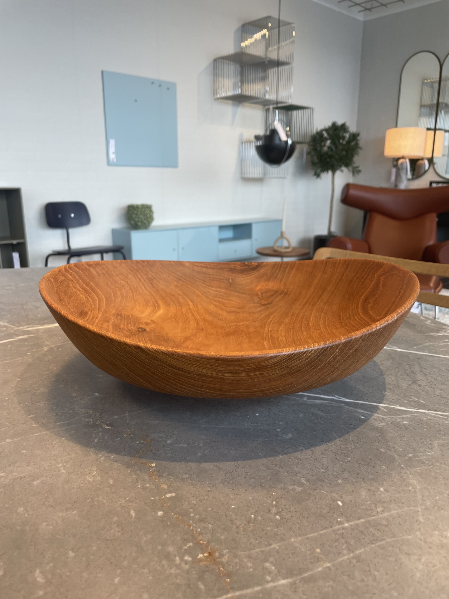 Designet er en perfekt cirkel, der skaber en illusion af en ellipse, og giver et nyt udtryk hver gang du drejer skålen. FJ Bowls fremstilles som frugt- og salatskåle. Alle skåle er lavet af en enkelt blok teak, der drejes og poleres i hånden. Et yderst omhyggeligt og komplekst træhåndværk.