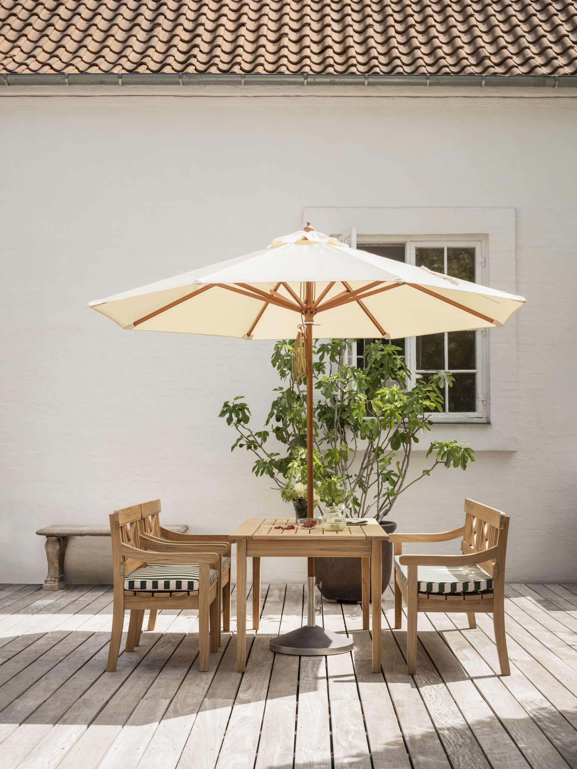 Nyd den svalende skygge under Messina parasollen, og få det maksimale ud af dine uderum. Messina er holdt i rene linjer og fremstillet i langtidsholdbart FSC-certificeret lakeret kapurtræ. Den robuste parasol vil beskytte dig mod solen og give dig skygge i mange år fremover. Tekstilet er ekstremt robust og behandlet, så det kan modstå vand og snavs. UV-beskyttelse: UPF50+, den maksimale solbeskyttelse for tekstiler. Messina parasollen Ø300 fås i råhvid eller i stribede varianter i farvekombinationerne mørkegrøn/abrikos og citron/sand. Et dobbelt træksystem gør det nemt at åbne og lukke parasollen. Passer til Capri Umbrella Foot 50kg.