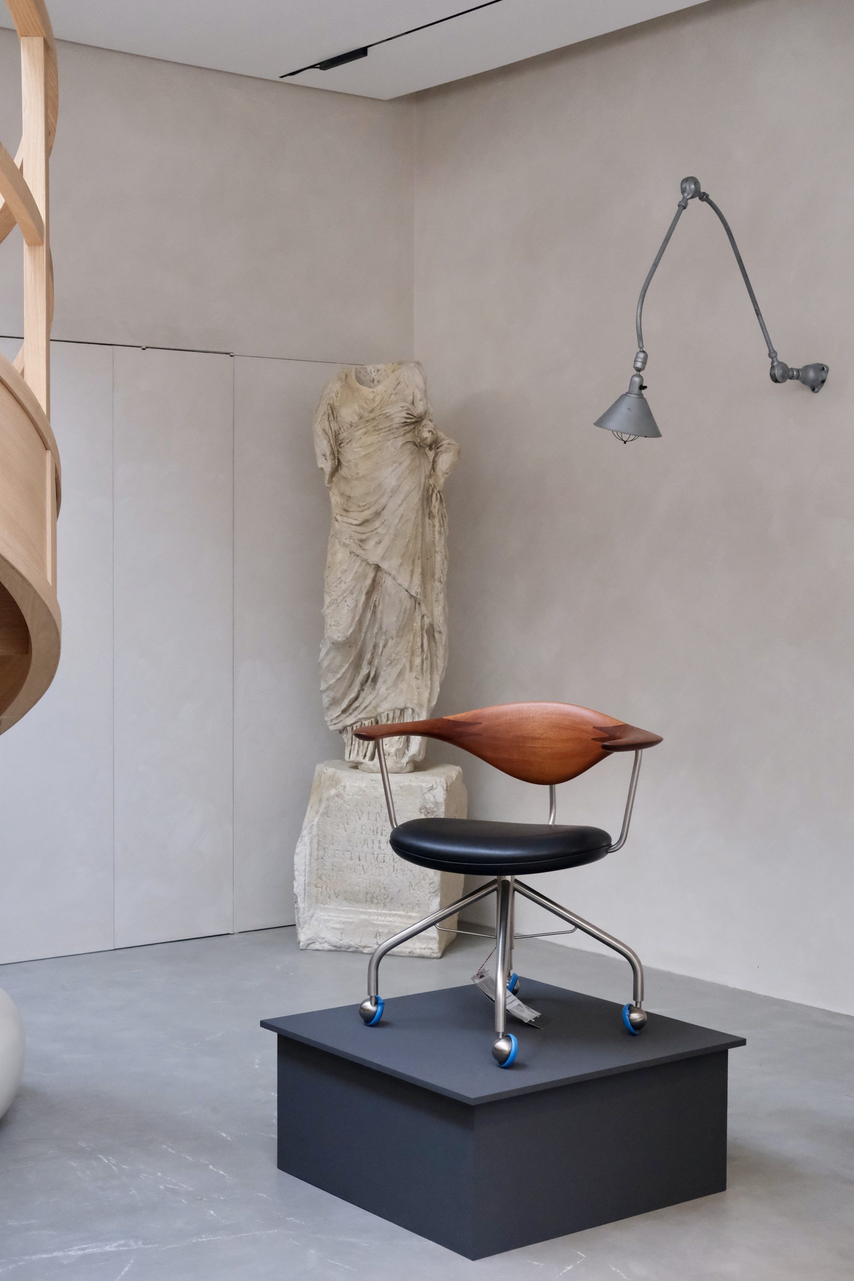 pp502 Kontordrejestolen fra PP Møbler er et kompromisløst møbel med komfort og ergonomi i højsædet. Produktionen af den eksklusive kontorstol kræver at snedkeren, møbelpolstreren og smeden ikke går på kompromis på nogen måde i deres arbejde. Det kombinerede arm- og ryglæn, er lavet af massivt træ. De forskellige stykker er skåret af nyfældede sheltertræer, der er cirka 150-200 år gamle. De afskårne stykker efterlades til at tørre i op til 2 år. Stellet er lavet af sølvloddet rustfrit stål og har en justeringsmekanisme, der gør det muligt for brugeren at justere stolens højde. Til polstring af sædet anvendes kun det fineste læder.