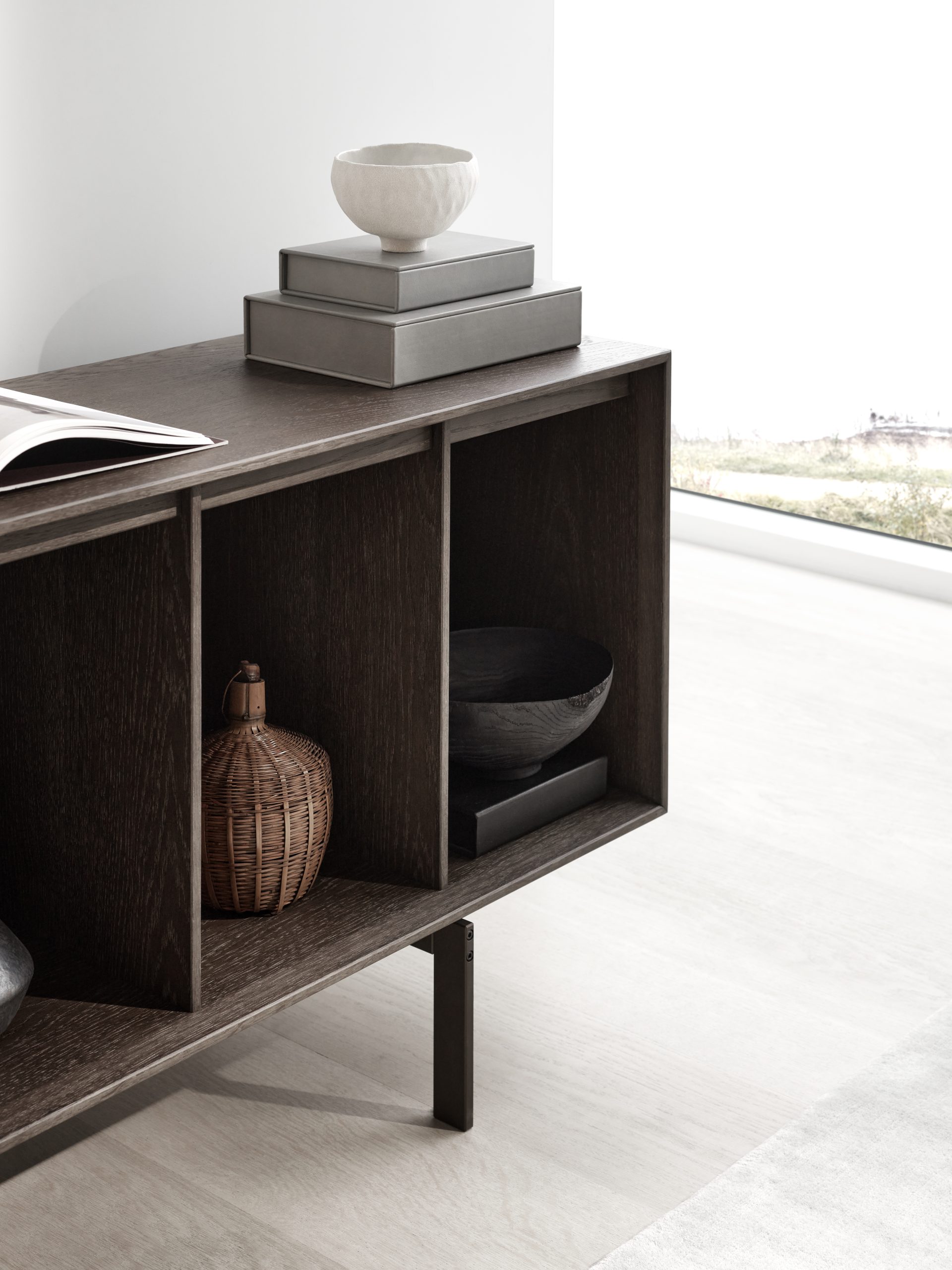 Vis dine ejendele frem på åbne hylder, eller gem dem bag en aluminiumslåge. Vipp675 Cabinet H1 er en separat opbevaringsløsning, der kombinerer fire åbne hylder til udstillede genstande med to lukkede skabe til skjulte genstande i en elegant designet opbevaringsløsning.