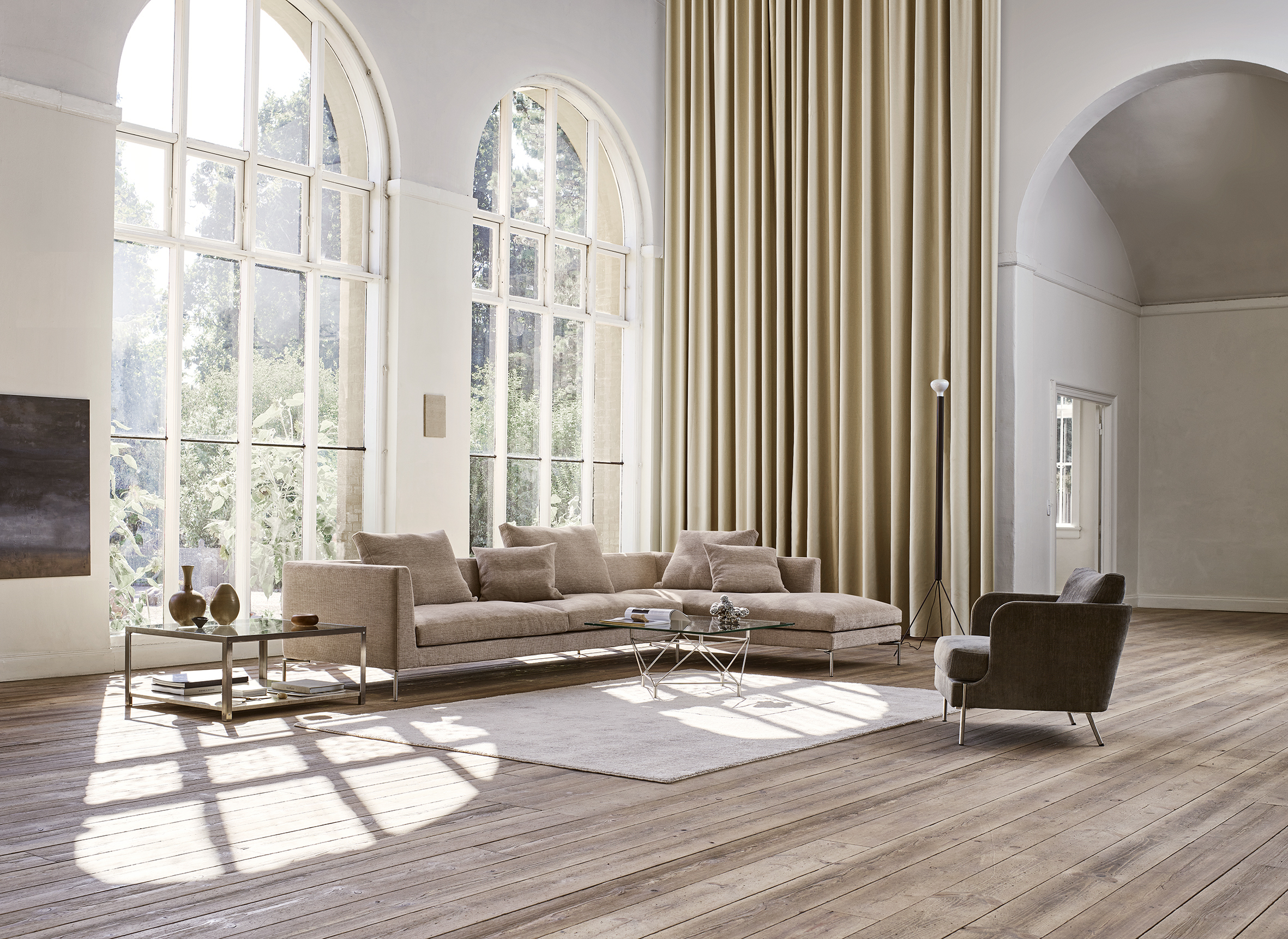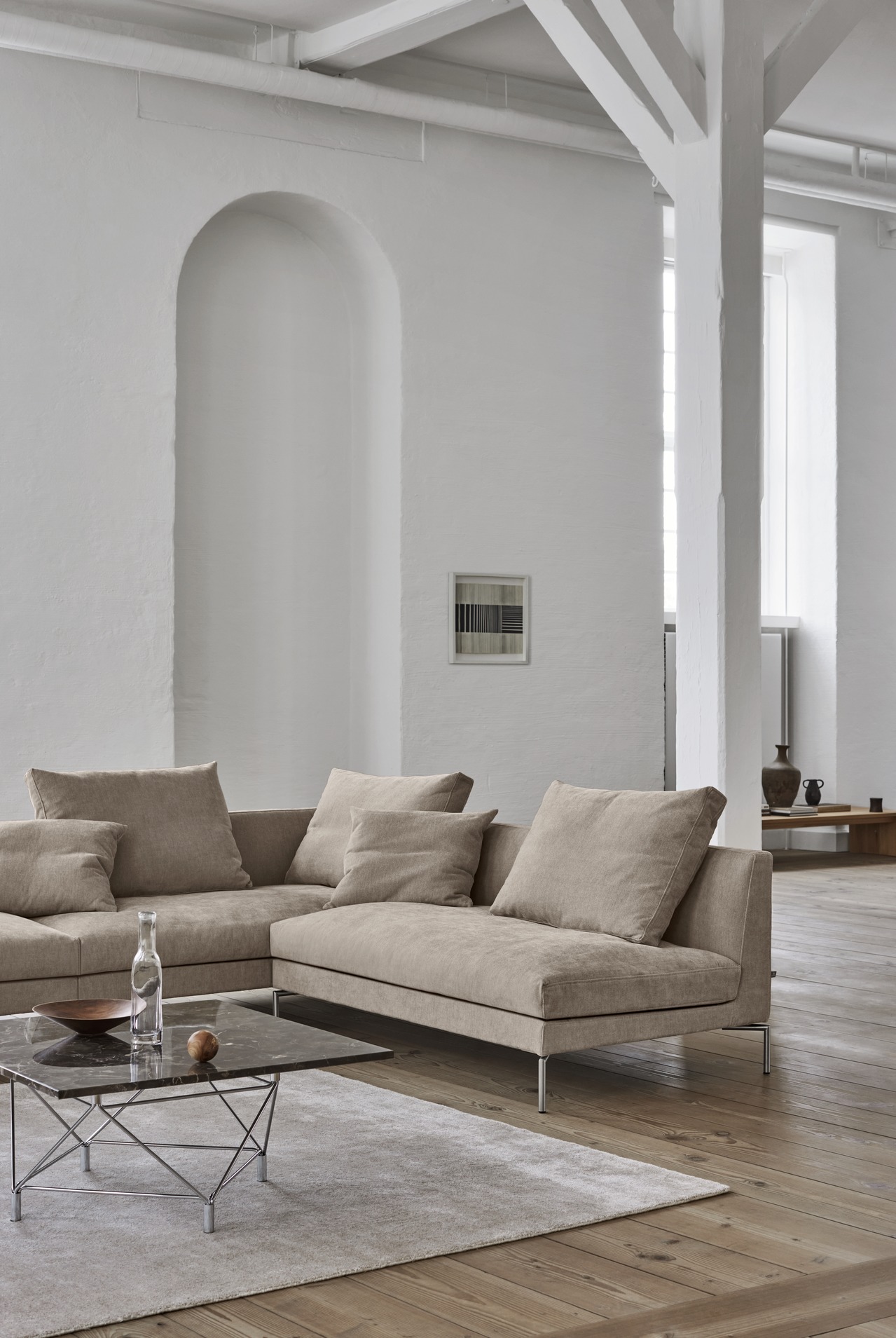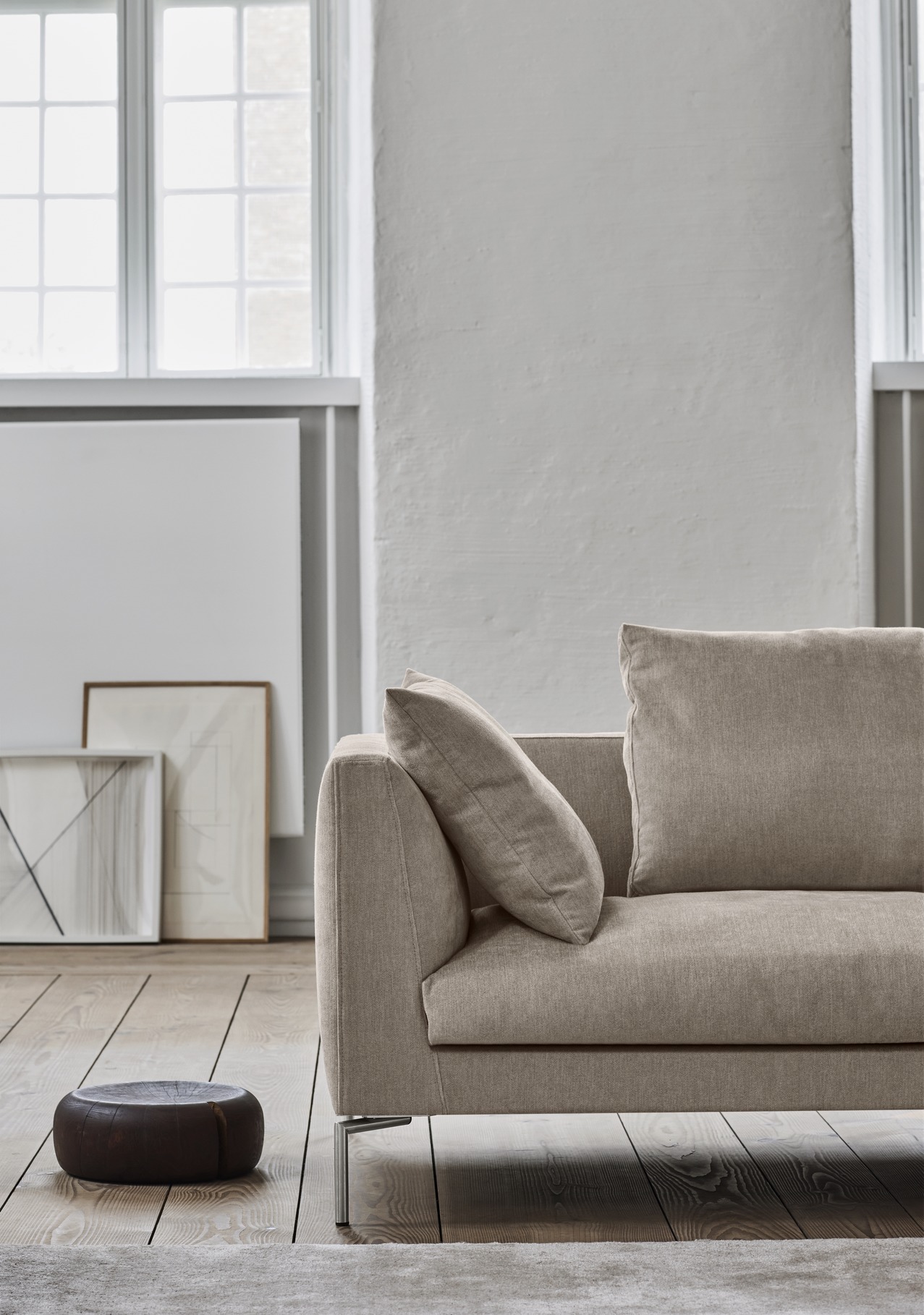 Du kan vælge sofaen som en klassisk 2- eller 3-personers model, eller du kan sammensætte din egen unikke modulopbygning. Benene er i slankt stål, hvilket næsten får sofaen til at se ud, som om den svæver let over gulvet. En særlig detalje er armlænet: Det har en smal top på 8 cm, men bliver gradvist bredere nedad. Det giver den perfekte støtte.